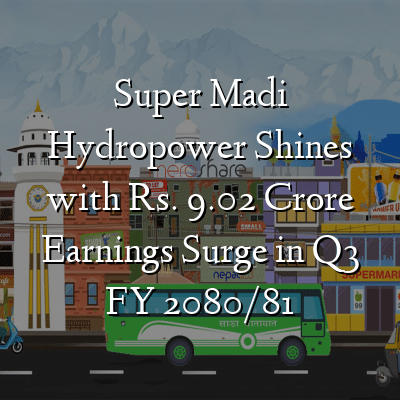 Super Madi Hydropower Shines with Rs. 9.02 Crore Earnings Surge in Q3 FY 2080/81 Leave a Comment / By / May 5, 2024 Super Madi Hydropower Shines with Rs. 9.02 Crore Earnings Surge in Q3 FY 2080/81